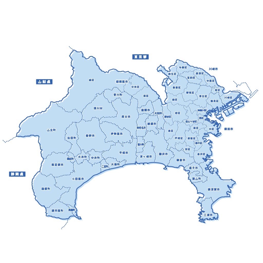 愛甲郡愛川町 /愛甲郡清川村/足柄上郡/厚木市/綾瀬市/伊勢原市/海老名市/小田原市 /鎌倉市 /川崎市/高座郡寒川町 /相模原市/座間市/逗子市/茅ヶ崎市 /中郡大磯町 /中郡二宮町 /秦野市 /平塚市/藤沢市 /三浦郡葉山町 /三浦市 /南足柄市 /大和市/横須賀市/横浜市